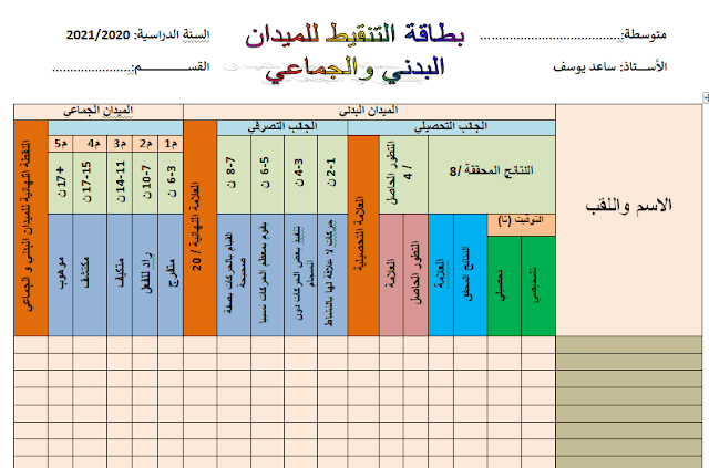 في هذا الموضوع نضع بين أيديكم " بطاقة تنقيط للميدان البدني والجماعي" بصيغة Word. والذي تسهل على الأستاذ العمل واحتساب نقطة التلميذ